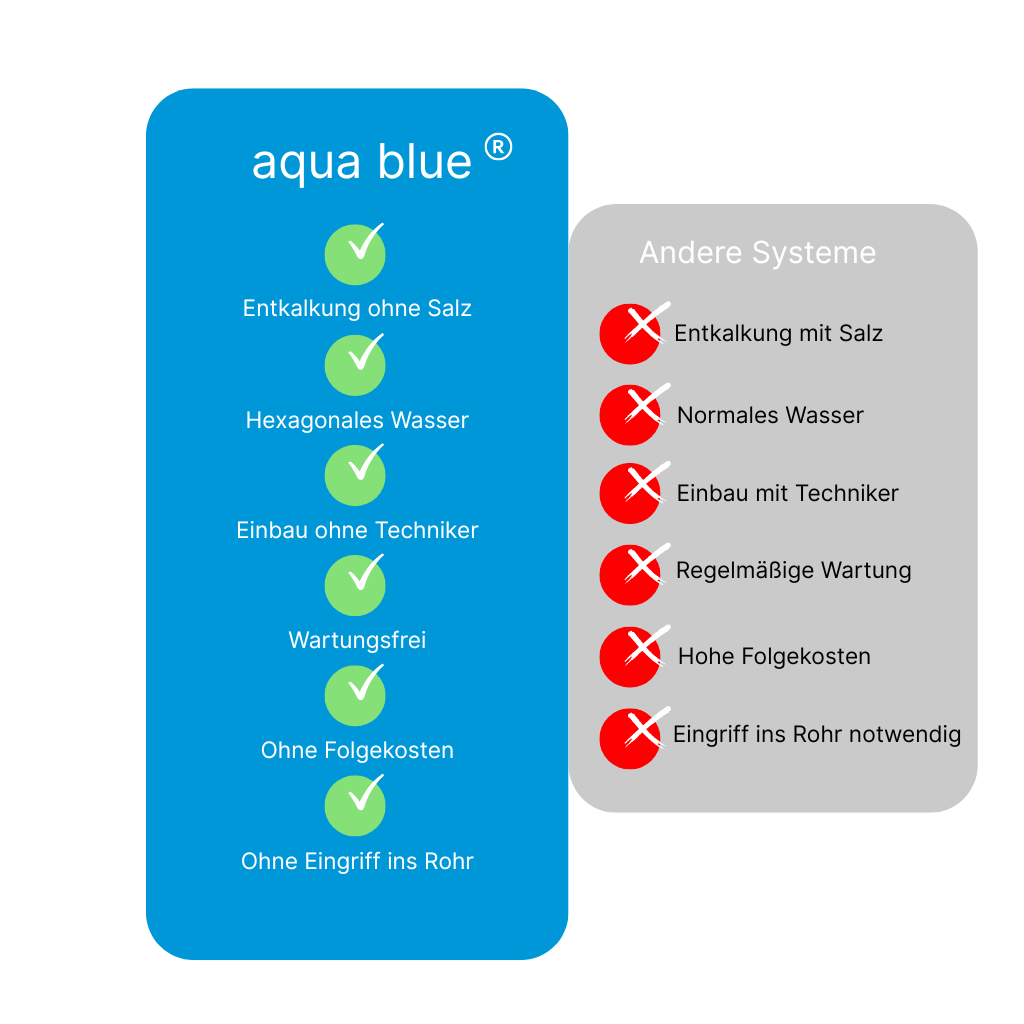 Der wichtigste Unterschied: aqua blue funktioniert komplett ohne Salz, Chemie oder Strom – und benötigt keinen Eingriff in Ihre Rohrleitungen.
