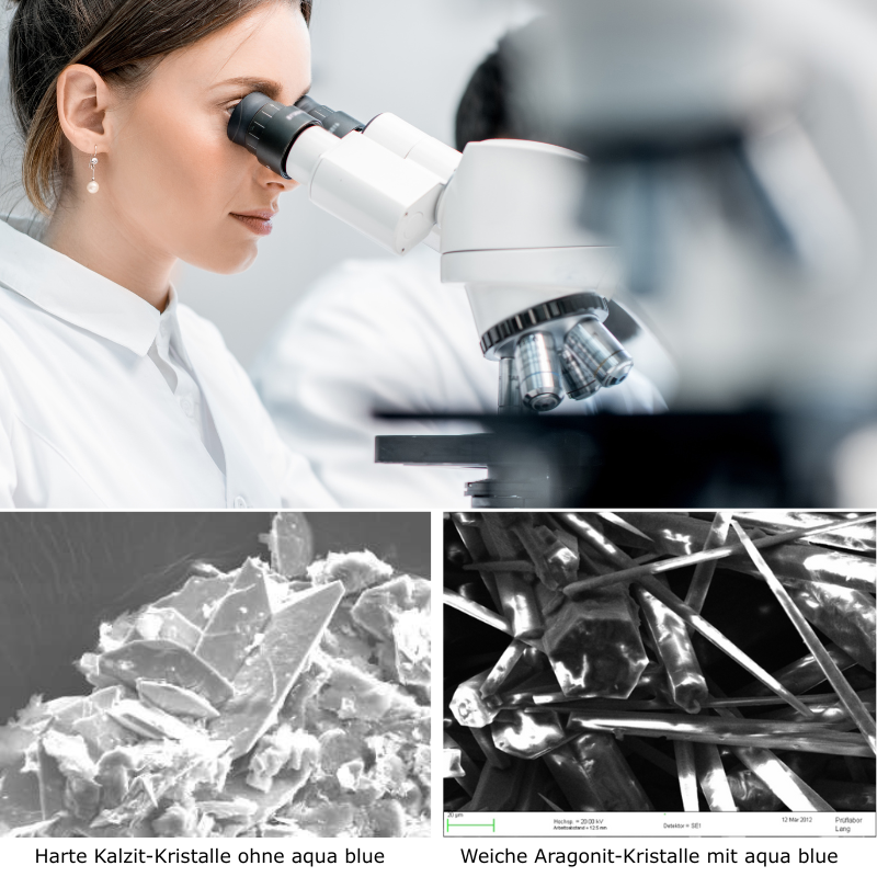 Während herkömmliche Enthärtungsanlagen dem Wasser Mineralien entziehen (z. B. durch Ionenaustausch mit Salz), verändert aqua blue die Struktur des Kalks auf physikalische Weise. Der Kalk bleibt im Wasser enthalten, kann sich aber nicht mehr hart ablagern – er bleibt weich und lässt sich leicht abwischen.