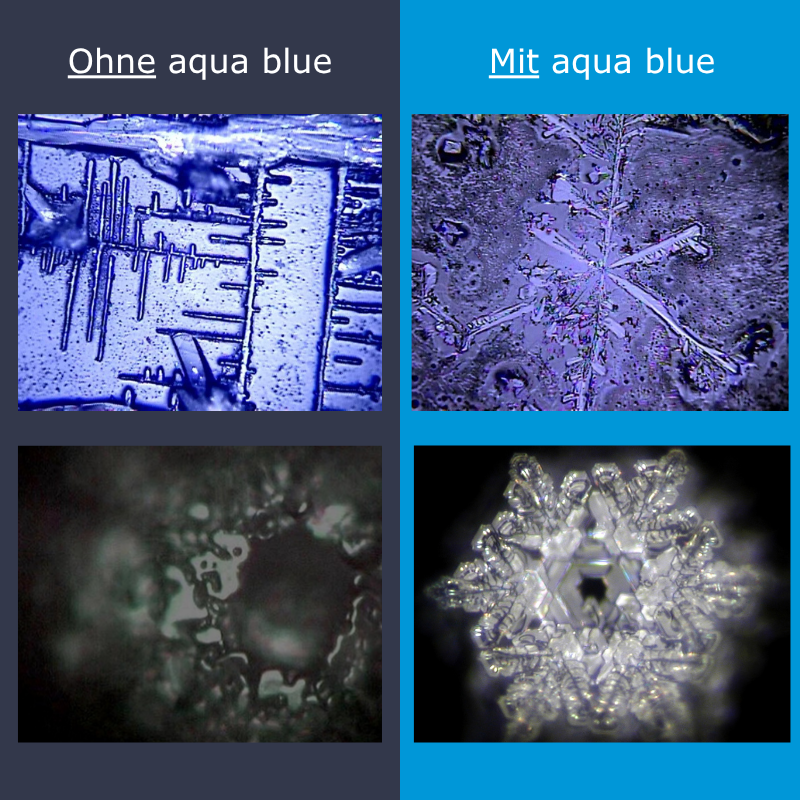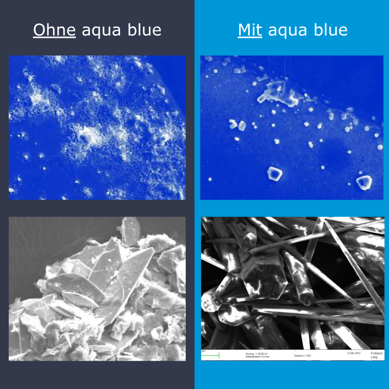 Kalk-Kristalle mit und ohne aqua blue mikroskopisch analysiert. Ihr Vorteil: Mit aqua blue haben Sie weniger Kalkablagerungen, die einfacher zu entfernen sind.